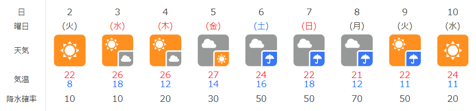 ※画像の10日間天気予報の気温は市街地の気温なので、そこから5℃ほど低くなります。